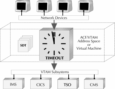 Timeout asynchronously monitors VTAM's session activity by periodically reflecting the activity in the SDT (Session Directory Table). If a specific session violates the active Rules, Timeout generates the appropriate VTAM VARY command in the form "VARY TERM,SID=" to terminate the session.